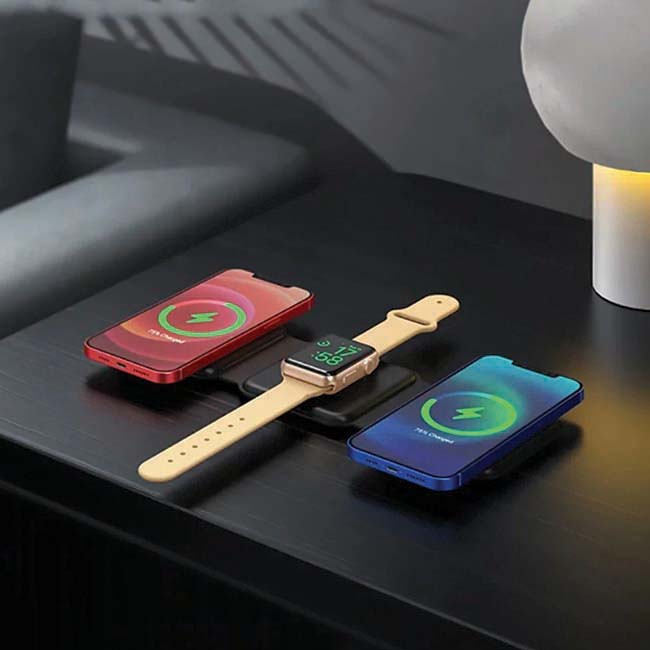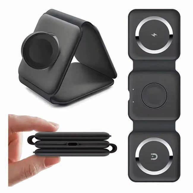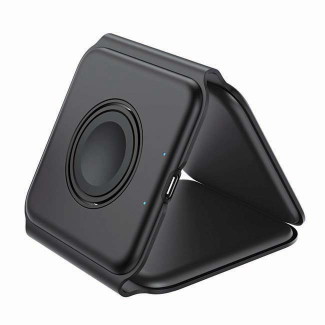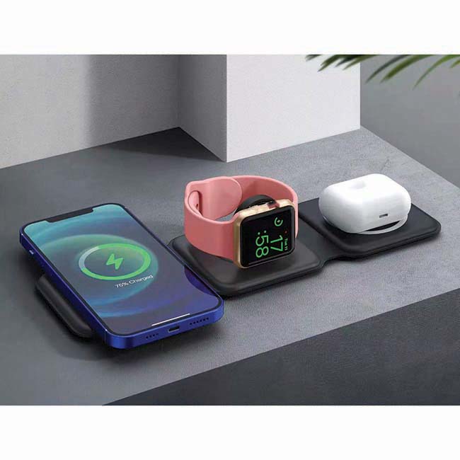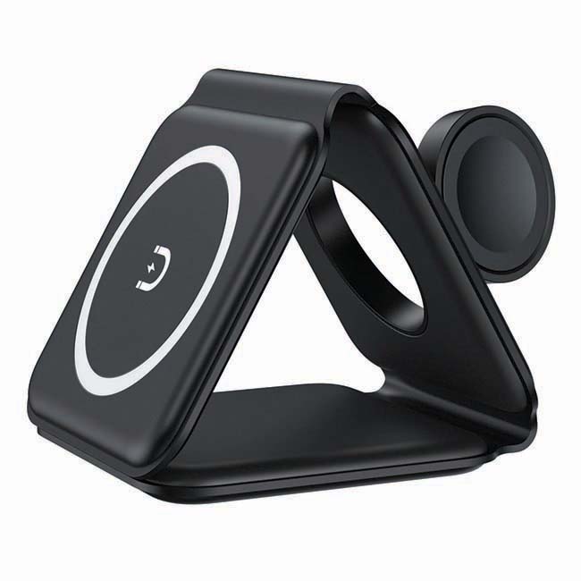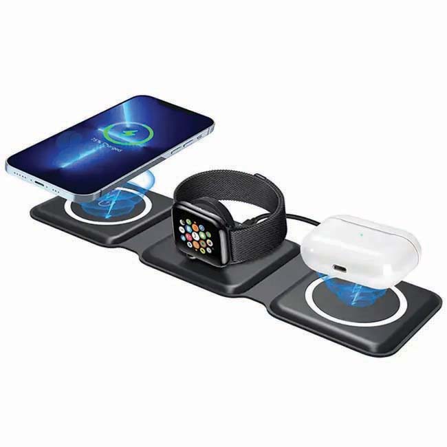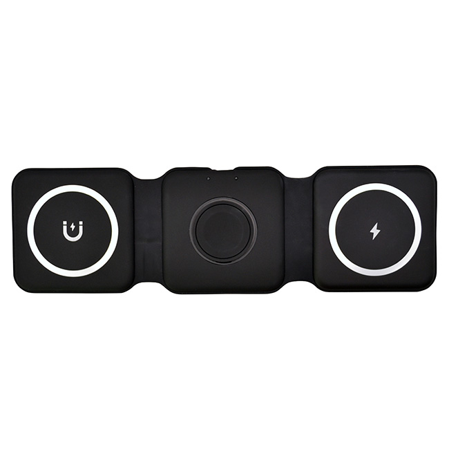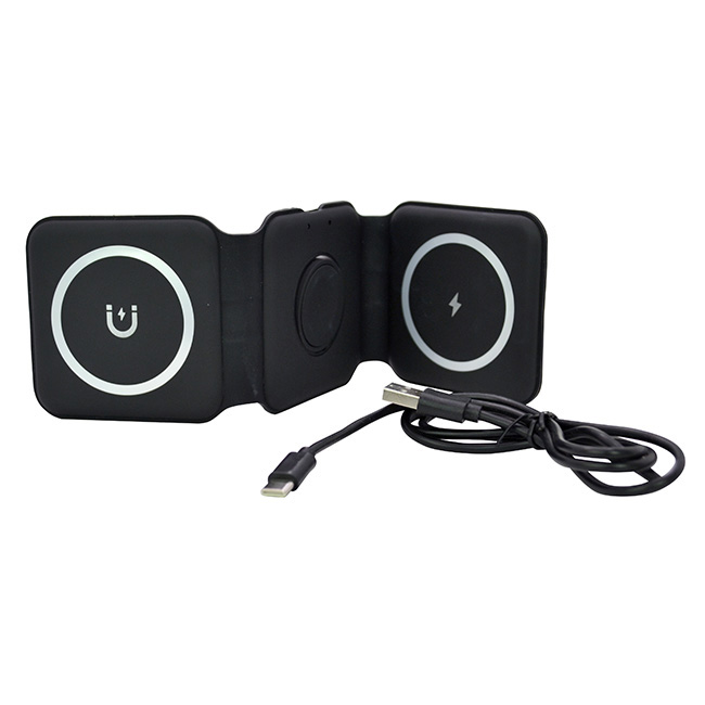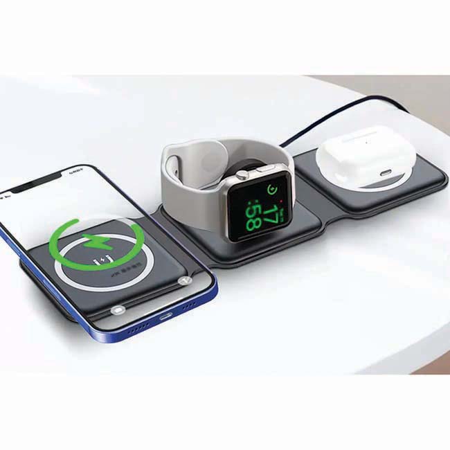 Cargador 3-1 Curie l Cargador para 3 dispositivos simultáneamente. l Estructura plegable y magnético. l Potencia de salida: 15W , 3W y 2.5W. l Puerto USB tipo C. l Incluye cable cargador de batería. l Incluye manual de usuario. l Colores: Negro