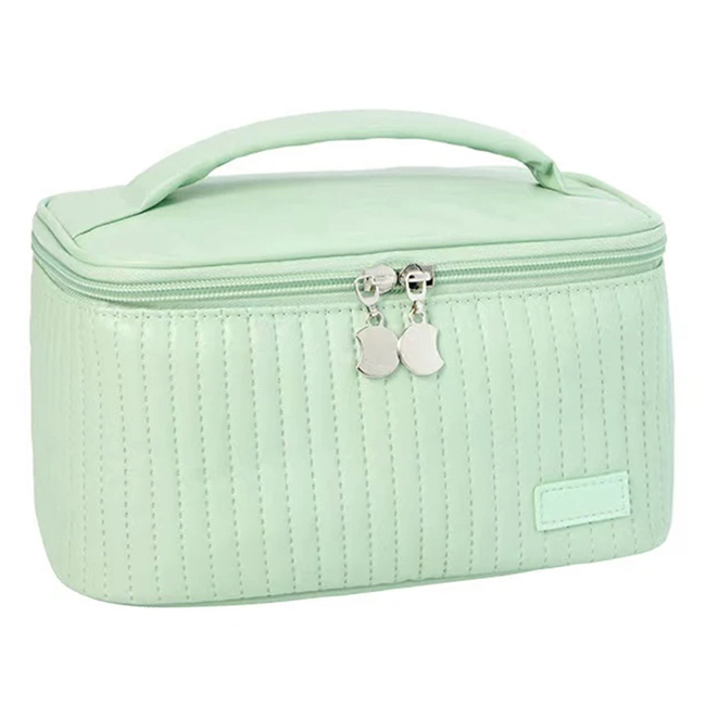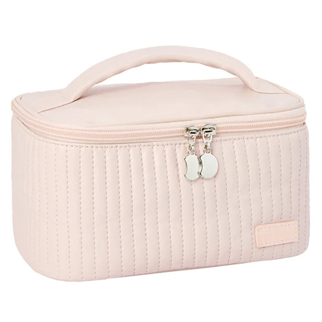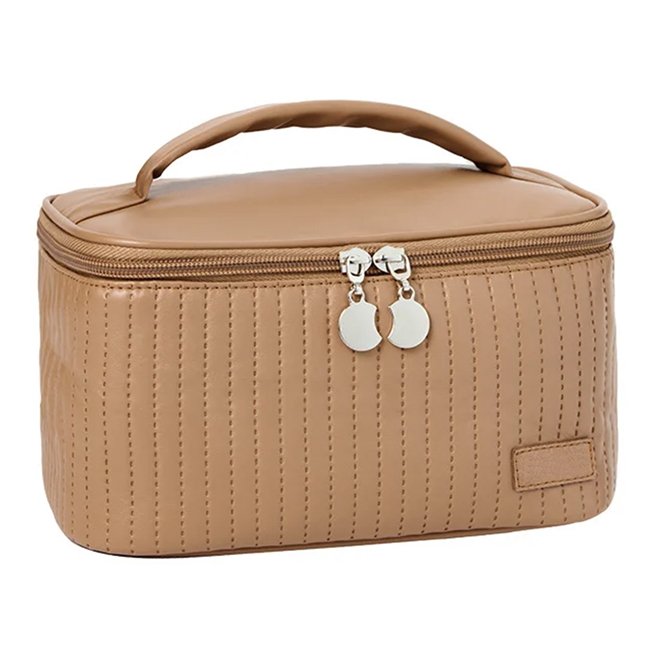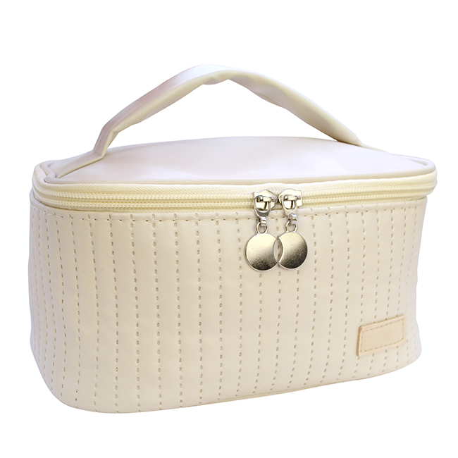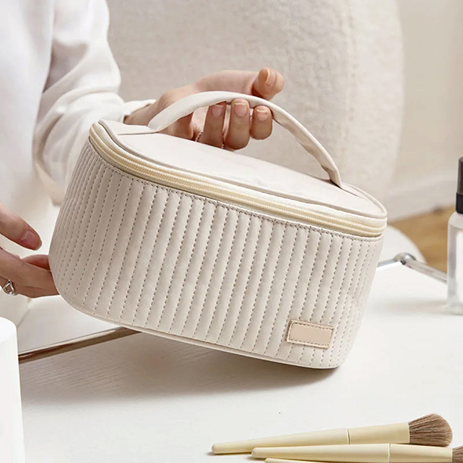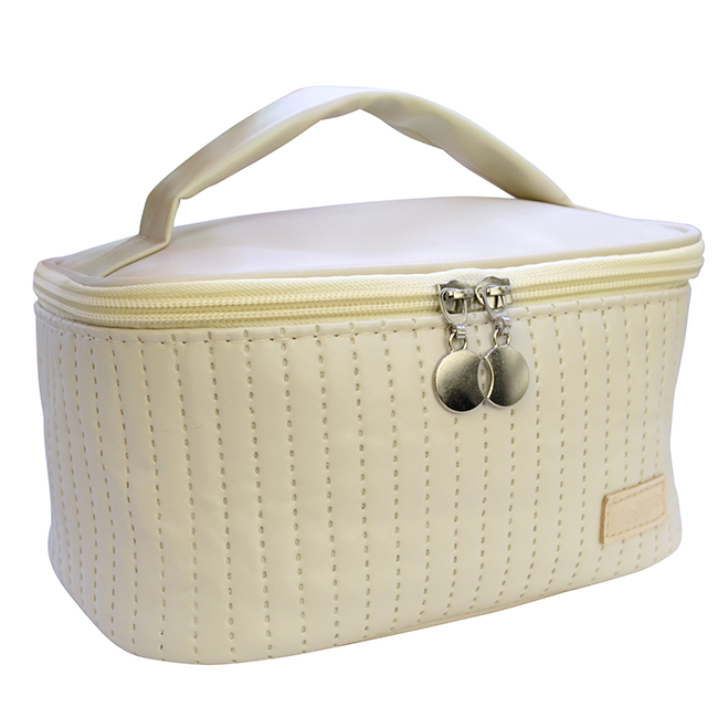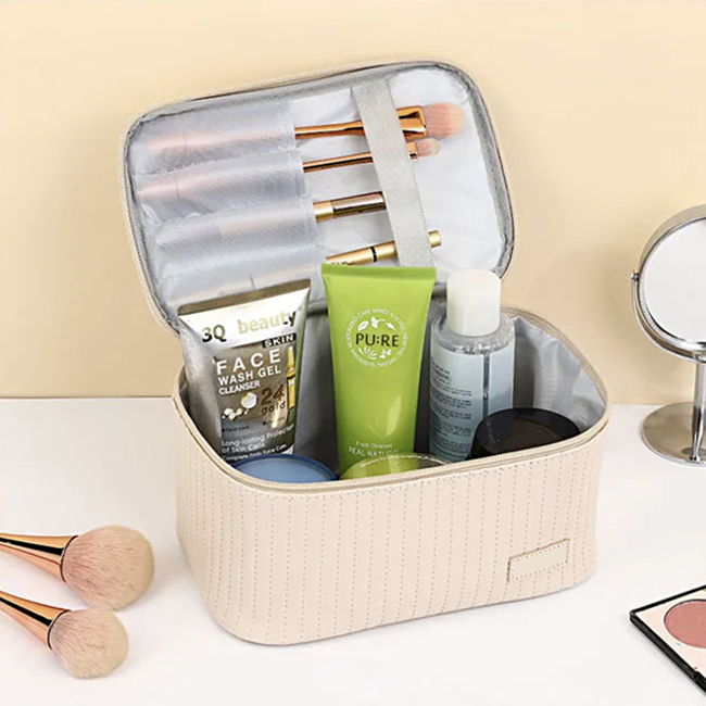 Cosmetiquera con cierre en zipper y correa en tapa para sujetar.