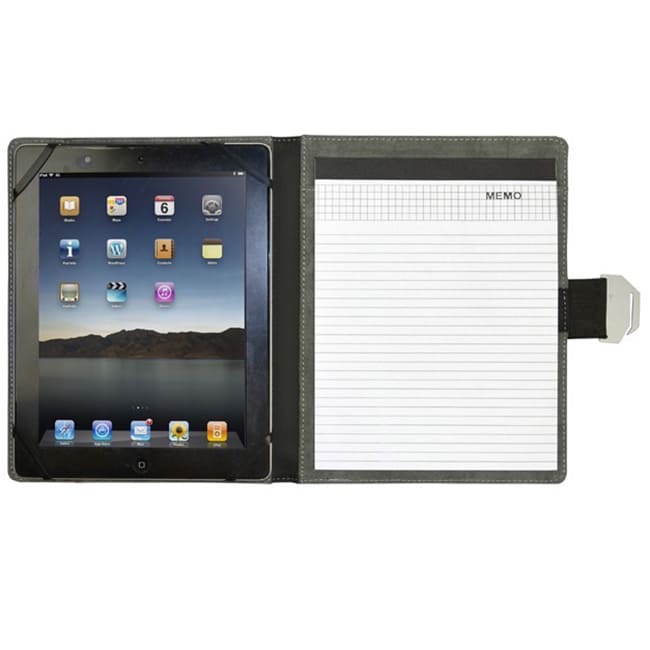 Porta Ipad Damasco Cierre con elástico y hebilla. Stand para I-Pad. Block de Notas. Compartimento exterior para documentos.