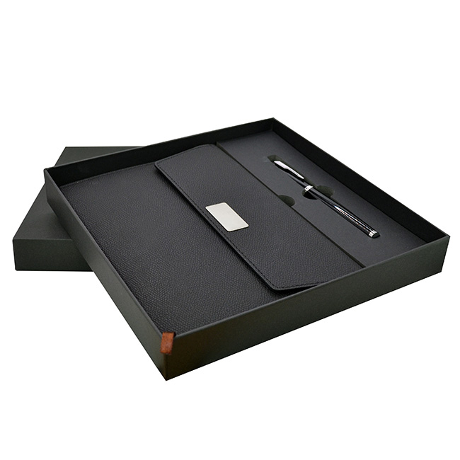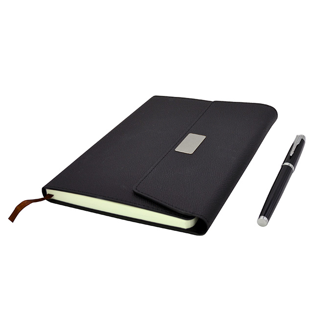 l Incluye libreta y bolígrafo en estuche de presentación. l Libreta con 80 hojas rayadas y planeador atemporal. l Cinta divisoria. l Cierre con ceja magnético y placa para personalizar. l Bolígrafo de metal con mecanismo rotativo. l Colores: Negro.